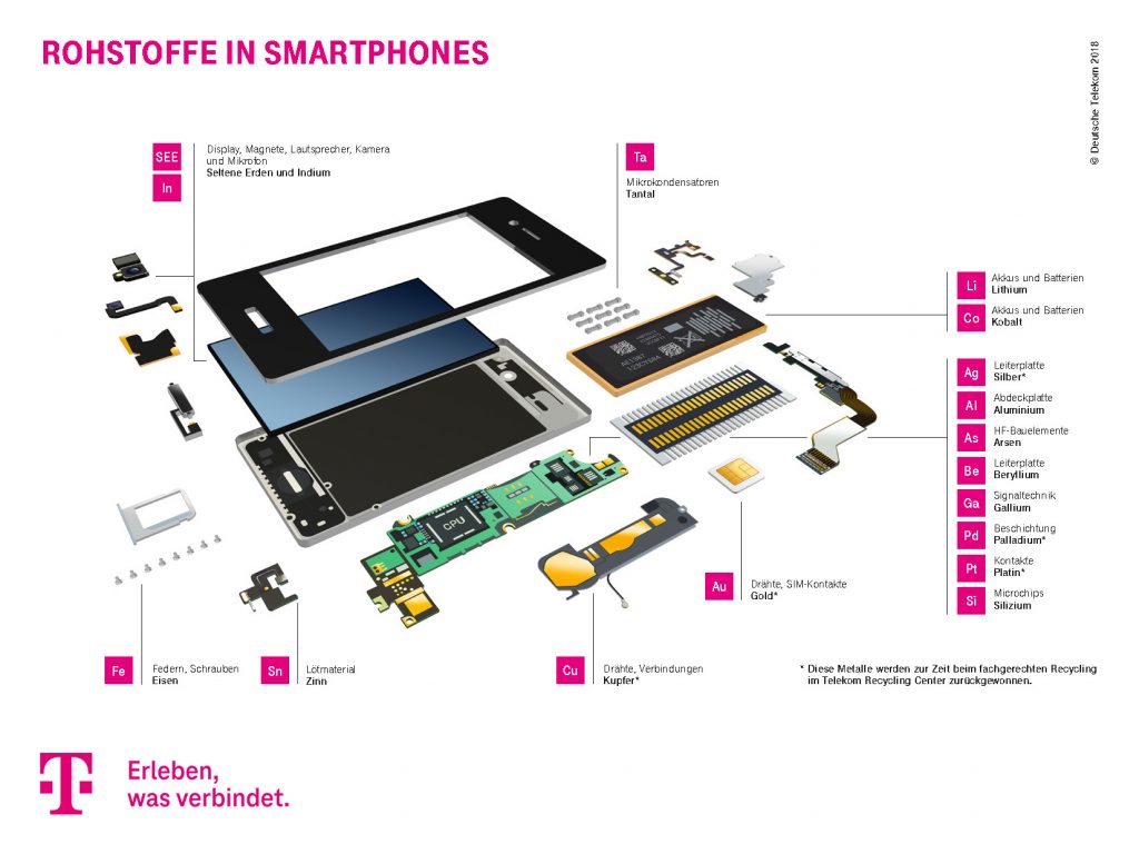 Neben Kunststoffen und Glas sind auch Metalle wie Kupfer, Eisen, Aluminium, Gold und Platin verbaut. Außerdem enthalten Smartphones rund sieben „kritische Metalle“, also Metalle, die selten sind und weltweit immer knapper werden. Zu solchen kritischen Metallen in Smartphones gehören Kobalt, Gallium, Indium, Niob und Wolfram.